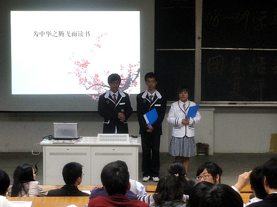 淡淡梅花香,烈烈中华骨。08会计一团支部坚定的选择了“为中华之腾飞而读书”作为他们的团日活动口号。书,一个与学生关系密切的物件,他们分别从如何爱护书,如何更好的利用书,如何辨别收藏好以后可能会用到的书本等一系列问题开展了他们的团日活动,在总结词中他们再一次喊出了“为中华之腾飞而读书”!