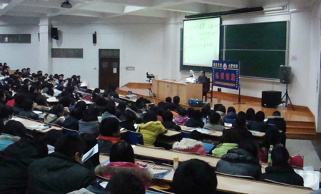 陈文灯教授在给同学们讲课辅导 12月11日晚,文昌院112教室座无虚席。中央财经大学数学部主任、享受国务院特殊津贴的著名考研数学辅导专家陈文灯教授,给我院学生作了一场考研中的数学问题讲座。 陈教授的助理首先向同学们介绍了我国目前的考研形势,指导同学如何树立正确的考研目标。其幽默诙谐的语言,深入浅出的讲解使同学们受益匪浅。 陈教授在讲座中强调指出 “掌控数学,研究生非你莫属!”,接着就近几年考研数学出题模式作了深入地分析。并例举了一些典型案例,结合自己的经历为大家讲述了考研的心得和经验,使同学们对考研的数学复习有了更深刻地认识。 最后,同学们纷纷上台与陈教授交流,陈教授也就大家提出的疑问耐心地作了解答。 本次由经管系分团委和学生会主办的讲座,让同学们对考研数学有了全方位的了解,同时指导大家如何设定合适的考研目标,增强了同学们考研的信心和决心。