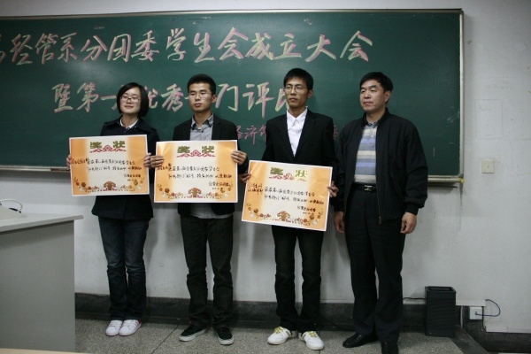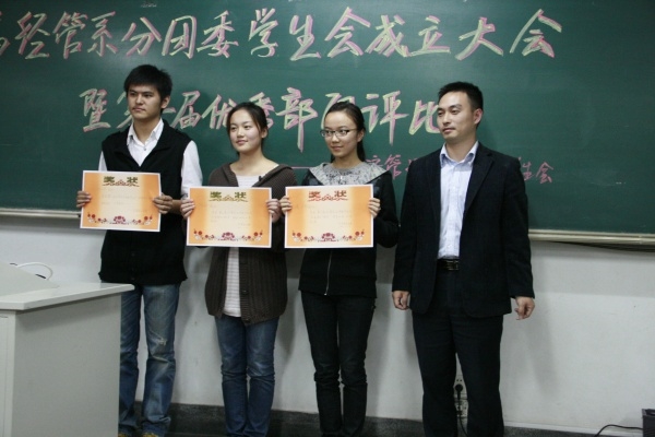 2010年10月14日下午5:30,经济管理系分团委、学生会首届优秀部门评比活动在文昌院103教室顺利举行。本次活动由经管系分团委组织部承办,经管系分团委宣传部,网络编辑部协办。分团委副书记冯雪堃担任主持,经管系党总支书记黄苏宁老师,分团委书记羊栋老师及原联席会成员担任评委。