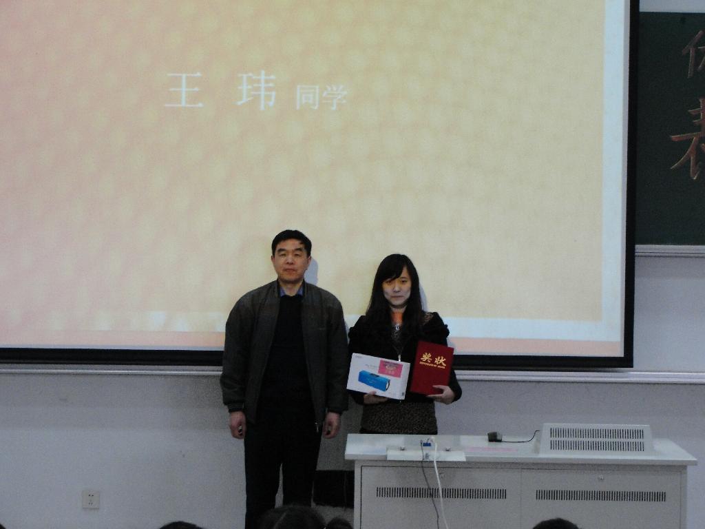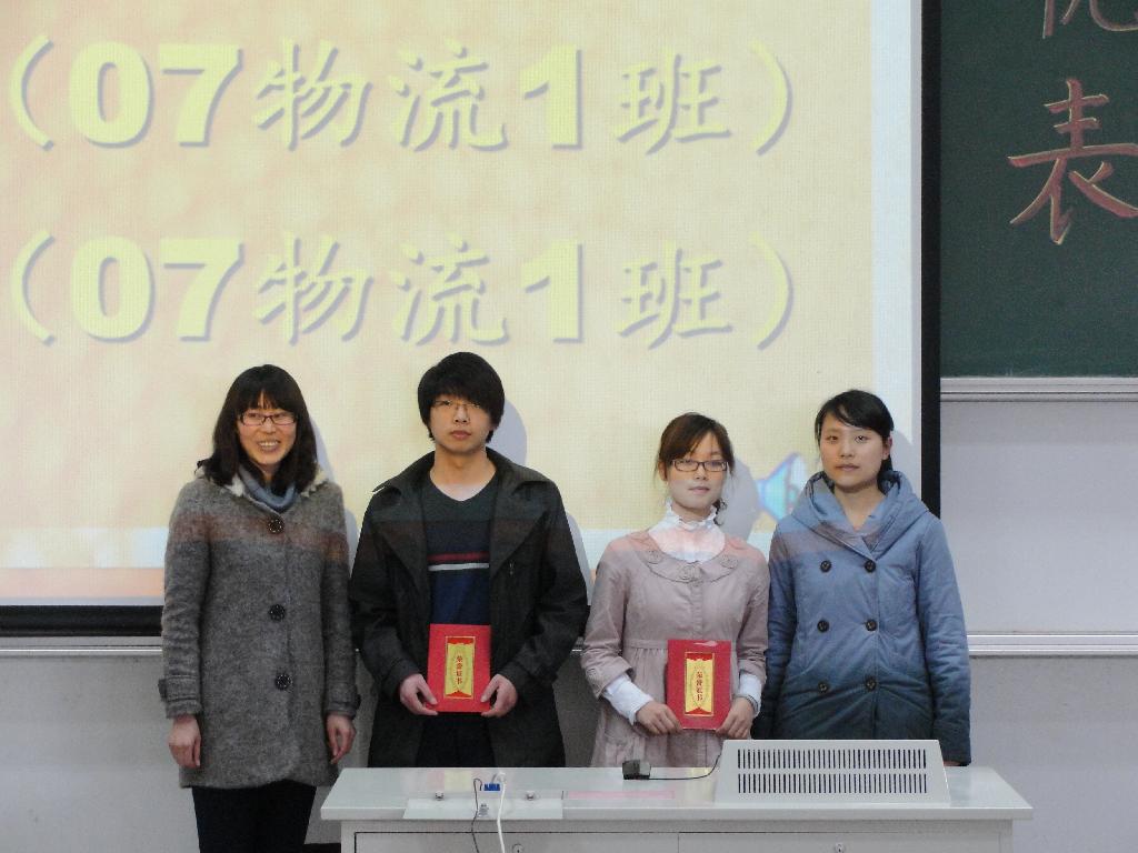 李清源老师首先宣读了《经济管理系2010年度社会活动优秀学生团队表彰决定》,对江苏省第六届创业设计大赛暨模拟沙盘经营(ERP)大赛一等奖的获奖者授予“2010年度ERP团队精英”称号,对江苏省第五届大学生职业生涯规划大赛的获奖选手授予“2010年度职业规划之星”称号。随后,由学生所在班级的辅导员老师亲自为他们颁奖。