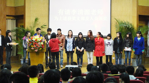 李清源老师为获奖学生颁奖 10月27日下午,经济管理系在真知馆报告厅召开2010-2011年度优秀学生竞赛获奖表彰大会。经济管理系党总支书记黄苏宁、综合办主任李清源、全体辅导员和学生干部参加了大会。会议由系分团委书记羊栋主持。 李清源老师首先宣读了《经济管理系2010-2011年度社会活动优秀学生团队表彰决定》,授予“用友杯”第七届全国大学生创业设计暨沙盘模拟经营大赛总决赛三等奖获奖选手“2011年度ERP团队精英”称号,授予江苏省第六届大学生职业生涯规划大赛获奖选手“2011年度职业规划之星”称号,授予江苏省教育厅“大学生实践创新项目”立项申报团队——甘肃漳县支教小分队“2011年度实践创新团队精英”称号。随后,获奖学生的辅导员们为获奖选手颁奖。 在今年省内外各类颇具影响力的赛事中,经管学子创造了卓越战绩,取得了丰硕成果。“ERP团队精英”代表赵文博、“职业规划之星”代表叶凡、“实践创新团队精英”曹胜虎及省先进班级、国旗团支部09财管2班代表徐君分别介绍了自己在参加校内外竞赛活动中的经验,他们由衷地感谢学院提供的广阔平台,丰富了他们的实践经历。现场视频及PPT演示也让与会者领略了竞赛的澎湃激情和实践创新的无穷魅力。 最后,黄苏宁书记在讲话中希望受表彰的团队和个人戒骄戒躁,再接再厉,在今后的学习和工作中继续起模范带头作用。成绩属于过去,发展成就未来,他希望广大同学以获奖选手为榜样,勇于实践,开拓创新,为促进新时期成贤学院的全面建设更上一个新的台阶而努力奋斗! |
