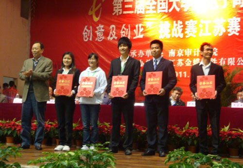 图左4为我院领奖代表 11月6日,第三届全国大学生电子商务“创意、创新、创业”挑战赛(江苏赛区)决赛在南京审计学院落幕。我院经济管理系黄欣晨、王晓茗、汪磊、王相柱、卢帆等同学组成“玖零E线”团队的“衣行E网”项目,在郑桂玲、孙亮老师的指导下,从南京航空航天大学、河海大学、苏州大学等48所院校组成的262个参赛团队中脱颖而出,荣获江苏赛区特等奖,顺利晋级11月26日在西南财经大学举办的全国总决赛。 全国大学生电子商务“创新、创意、创业”挑战赛是由教育部高等学校电子商务专业教学指导委员会面向全国高校(含港澳台地区)举办的大学生竞赛项目,是教育部、财政部“高等学校本科教学质量与教学改革工程”重点支持项目。本届比赛分省赛、国赛两个赛程,江苏省分赛区共设特等奖7名、一等奖7名、二等奖24名、三等奖42名,获特等、一等奖的团队将代表江苏省参加全国总决赛。 这是我院第一次组队参加本项比赛,参赛师生得到了学院领导的大力支持,在经济管理系领导、老师和同学的指导和帮助下,放弃了周末和暑假的休息时间,经过6个多月的不懈努力,紧抓创新,突出创意,立足创业。通过比赛,学生的“三创”(创新、创意、创业)能力得到了有效提升,为其职业生涯打下了坚实的基础,也体现了学院“以赛促学”的宗旨。