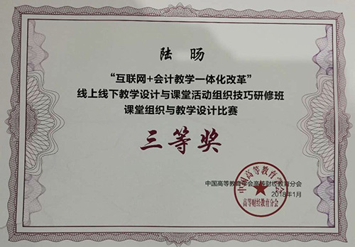 2018年1月,由中国高等教育学会高等财经教育分会主办的“互联网+会计教学一体化改革线上线下教学设计与课堂活动组织技巧研讨会”在广州举行,全国83所财经类院校共216名专家学者参会。我校永利集团88304官网财务管理专业教研室主任陆旸及财务管理专业青年教师卢颖应邀参加,陆旸老师在团队课赛中获得三等奖。