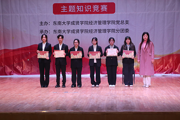 决赛现场共分三个环节。在第一环节“有问必答”中,各代表队分别举牌作答,选手们凭借扎实的理论基础,从容应对,参赛队伍得分交替上升,难分伯仲;第二环节“争分夺秒”场面十分热烈,选手们你追我赶抢答,将全场的气氛推到高潮;最为刺激的第三环节“一锤定音”,是对选手们知识储备、心理素质和应变能力的全面考验,他们的精彩回答赢得了现场观众阵阵掌声。经过激烈的角逐,国际经济与贸易党支部获特等奖,市场营销党支部获一等奖,物流管理党支部税收学党支部获二等奖,会计学党支部、财务管理党支部、电子商务党支部获三等奖。